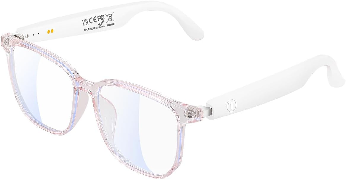 The open ear style allows you to stay connected to your surroundings while enjoying your favorite music or taking calls. The clear lens with a chic pink frame adds a touch of elegance to your look while providing protection against harmful blue light emitted from screens.